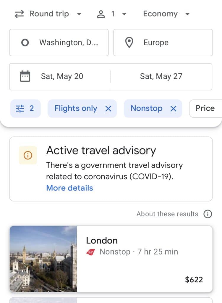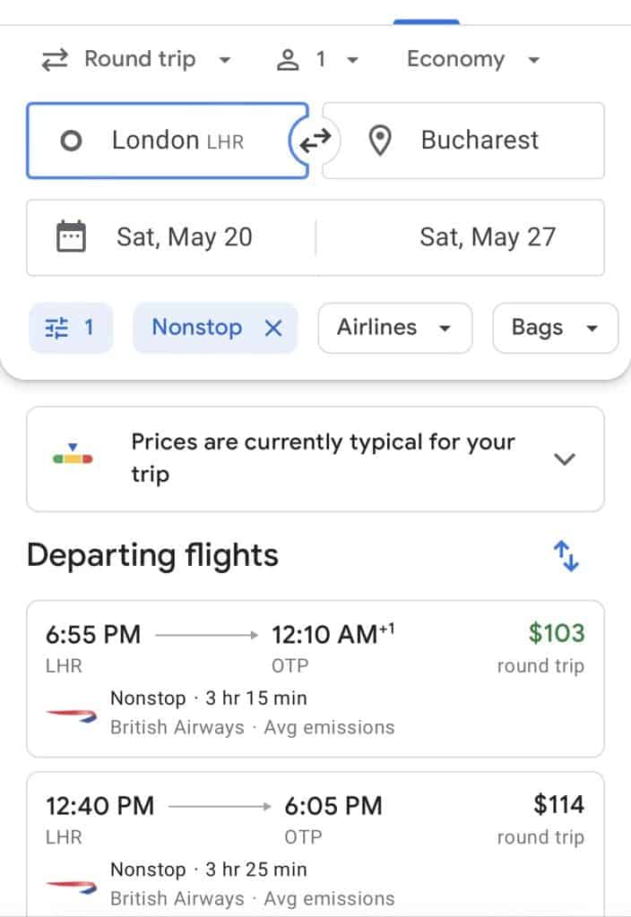 You may be thinking: “Well, what else would I be looking for?” But take an example that I just found on Google Flights this minute with no real planning involved. Say I wanted to go from Washington, D.C., to Bucharest, Romania to go explore the castles and mysteries of Transylvania and beyond (yes, I have October brain right now 👻 🧛♀️ 🧙🧟♀️)