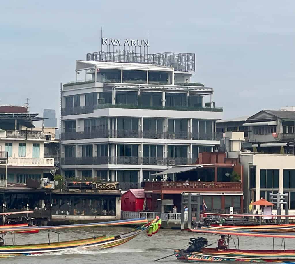 Next, we hopped on the water taxi near our hotel’s sister property, Riva Surya, where you can also use the pool and gym with a nice view of the Chao Phraya River – the massive main waterway that runs through Bangkok.