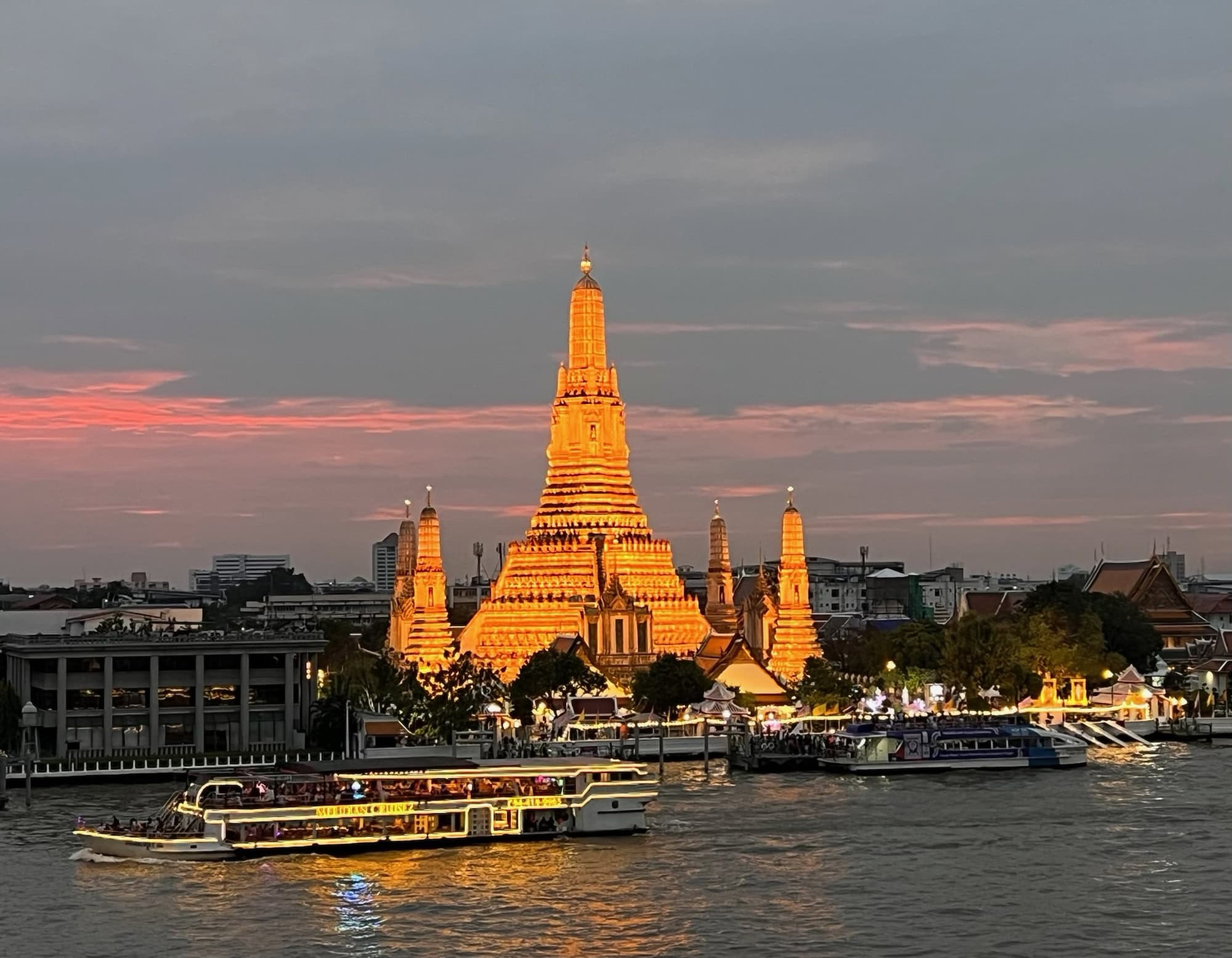 On our last morning in Bangkok, we enjoyed a lovely room-service breakfast on our balcony — with Wat Arun and the bustling activity on the Chao Phraya River as our backdrop — before bidding farewell to this incredible city and catching an afternoon flight to Luang Prabang on AirAsia.