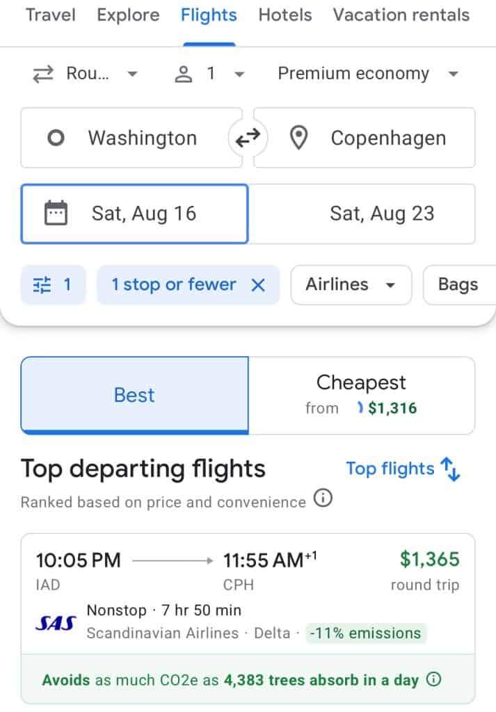 ✅ This option is very convenient for us because Scandinavian Airlines (SAS) offers direct flights from our home airport, Washington Dulles (IAD) to Copenhagen, Denmark. They also have direct flights from Newark (EWR), Boston (BOS), Chicago (ORD), Los Angeles (LAX), and San Francisco (SFO).