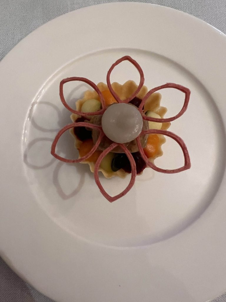 This dish was a bit intense in flavor, but the presentation was fantastic, with a play on a wild mushroom. Pheasant is a game meat, and not our favorite, but it was blended with a light sweetness from the apple and a tart element from the berry sauce that made it quite pleasant (pleasant pheasant?).