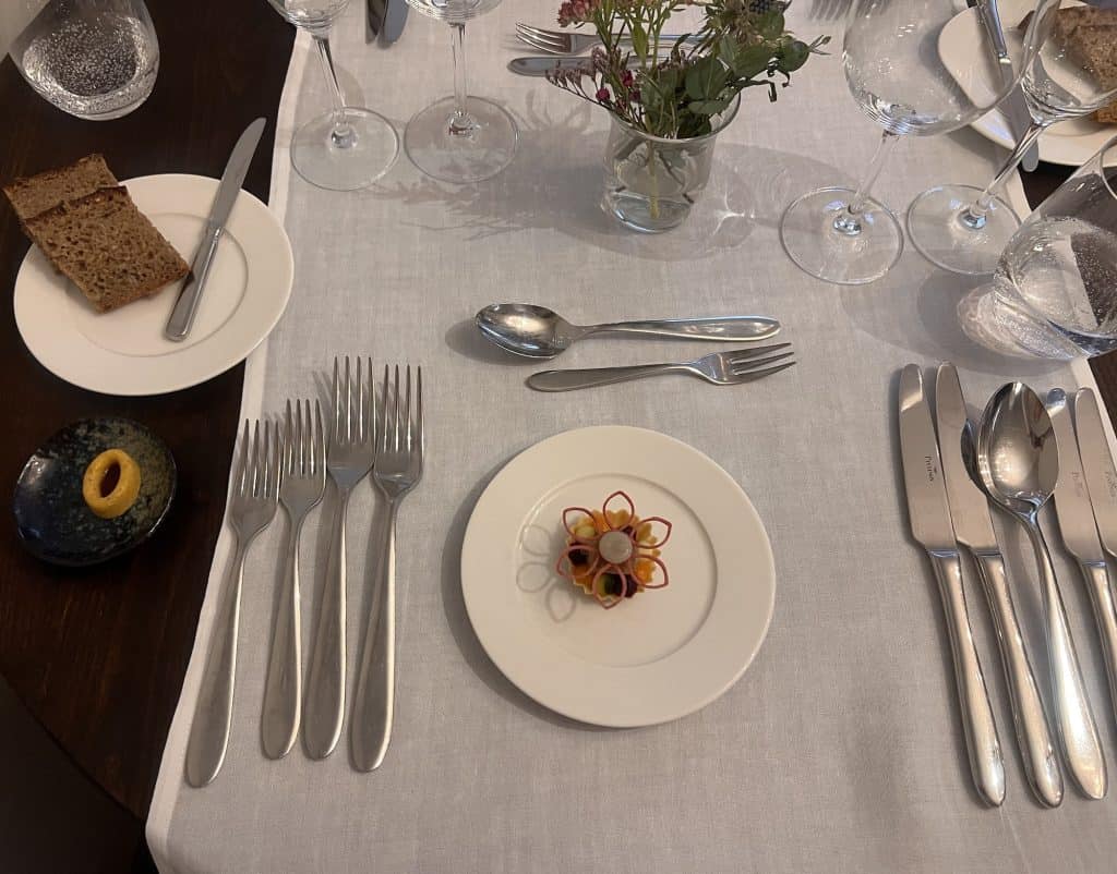 You can choose from a 7-course tasting menu for €60 or a 9-course menu for €70 per person. You can also opt for a wine pairing for €25 or €35, respectively. The menu changes four times a year with the seasons.