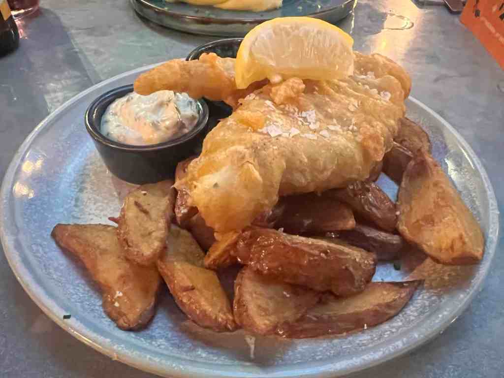 🍔 We tried the fish and chips, which came with a crisp batter and flaky fish, and a cheeseburger that was flavorful without being overly heavy. Both plates felt like the right size for midday (the lunch portions are smaller than the regular menu options).