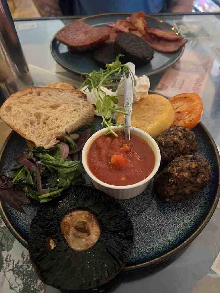 🍳 We shared the full Scottish veggie breakfast but added sides of the meats from the traditional version, including sausage, bacon, and black pudding. This way we got to try it all.