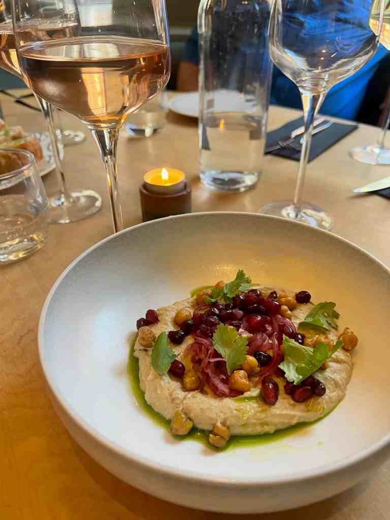 The menu is built around small plates, which is a great way to try a few flavors and share with your group. This wasn’t our favorite meal of the trip, but there were some delicious highlights, and the service was outstanding. Our favorites were the wild mushroom spring rolls, Newhaven crab crumpet, and the hummus. But we would skip the Scotch egg and the steak next time.