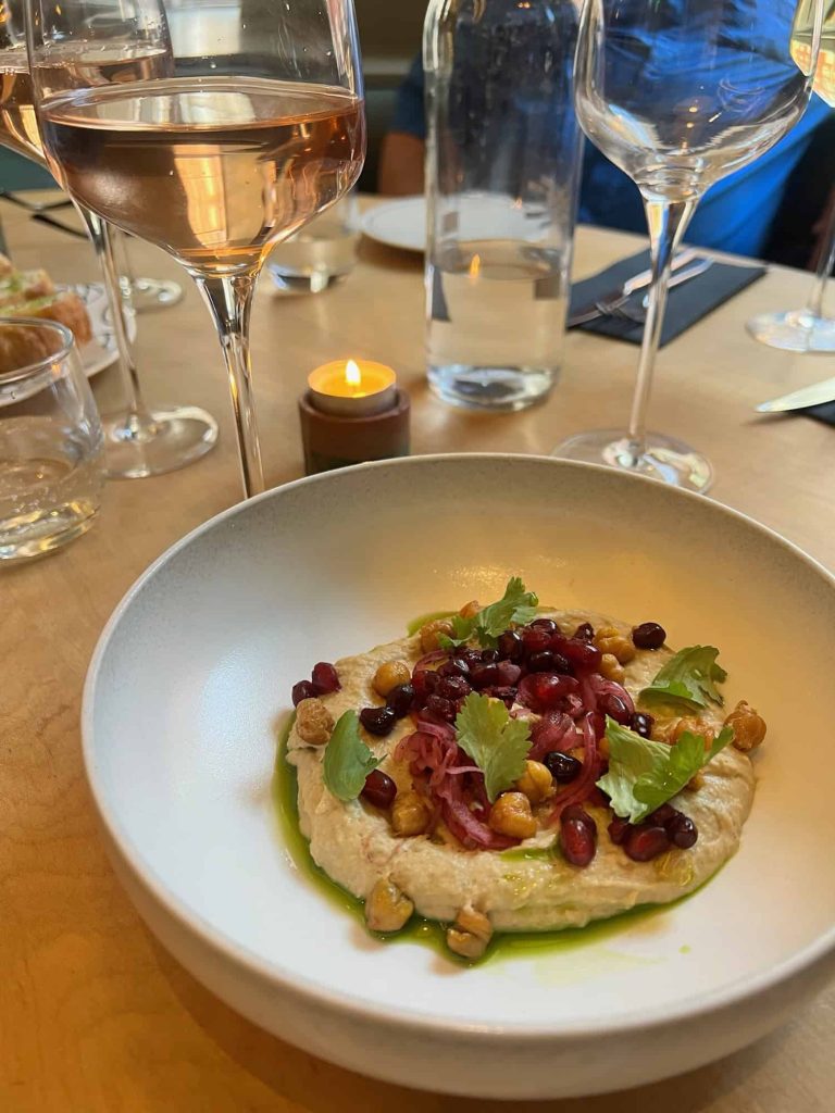 The menu is built around small plates, which is a great way to try a few flavors and share with your group. This wasn’t our favorite meal of the trip, but there were some delicious highlights, and the service was outstanding. Our favorites were the wild mushroom spring rolls, Newhaven crab crumpet, and the hummus. But we would skip the Scotch egg and the steak next time.