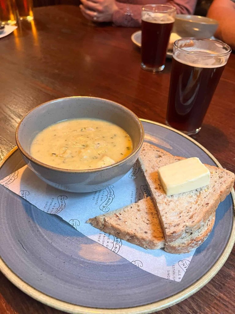 We chose The Mitre, a traditional pub on the Royal Mile. It is a casual spot that’s easy to reach from the castle, and their Cullen Skink (a creamy smoked haddock soup) is filling (but light enough after that hearty breakfast) and a great sample of traditional Scottish food.
