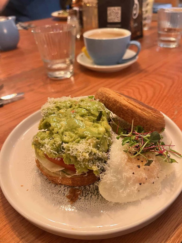Start your day at Brewhemia, which is right next to Waverley Station. It is a large space with a lively vibe, and the Rabbie’s breakfast is a solid choice if you want to try haggis and black pudding. They also serve a vegan fry and banana pancakes, which I can’t wait to try next time. Our group went with a mix of options, and my favorite was the egg and avocado on a croissant.