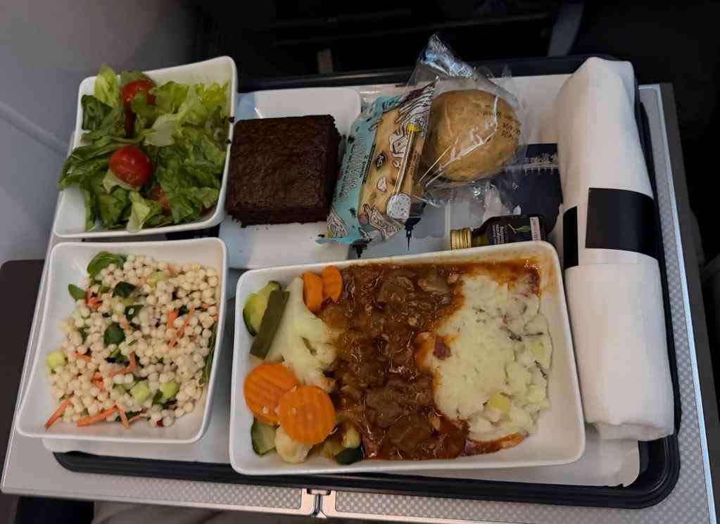 The first meal service took place promptly after take‑off at dinner time, which was perfect. There was plenty on the tray to pick and choose. Some items (including the main dish) were great and some were meh, but overall it was really solid and there was plenty to choose from. The meal options were the same as economy, but it’s nice to be served first in the small forward cabin.