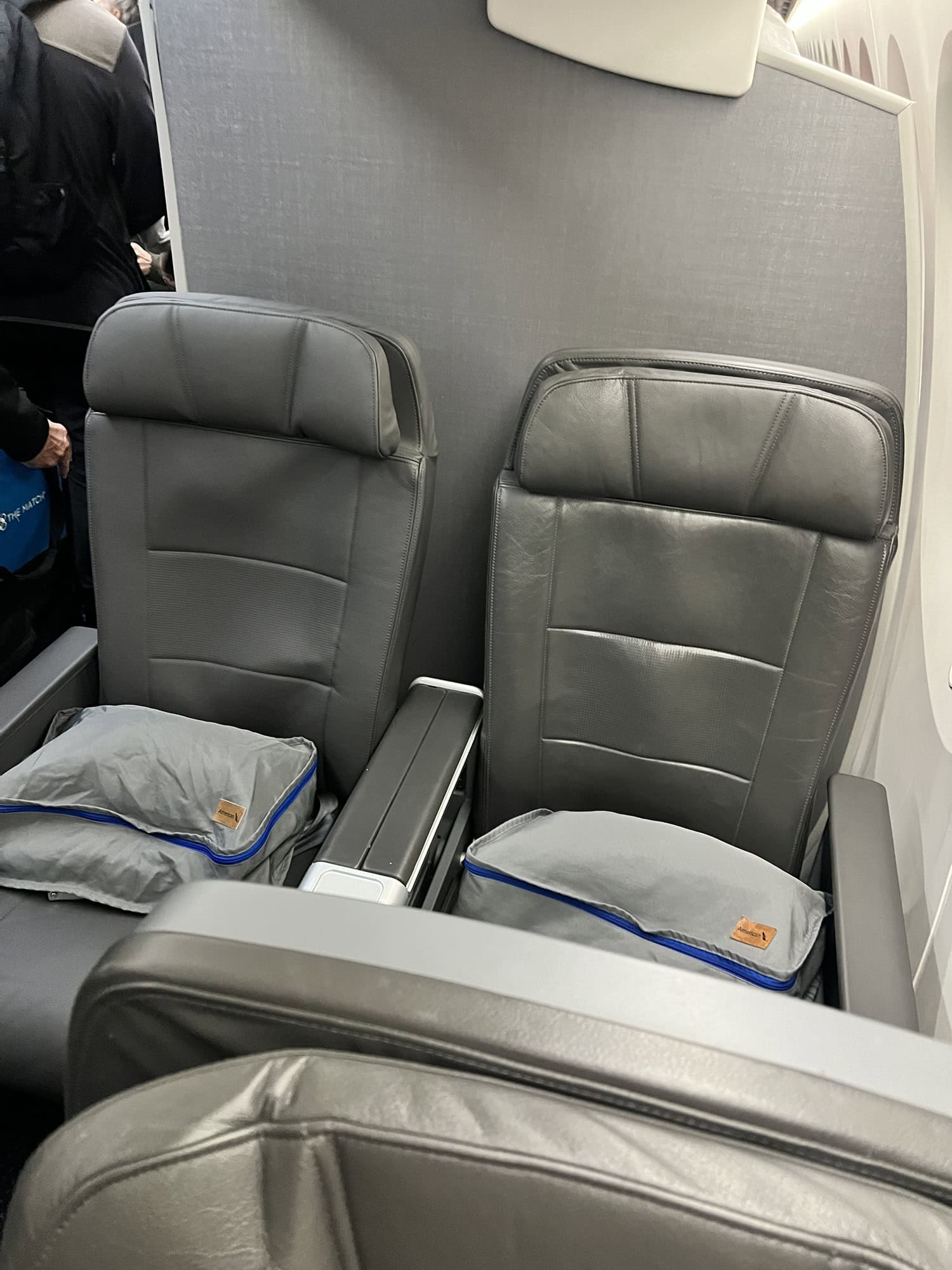 The seats were super comfortable and very similar to domestic first class, but maybe even a step up. On the Boeing 787‑9 (the aircraft we flew), the seat dimensions were approximately: 38‑inch pitch, 19‑inch width, and a 7‑inch recline. The cabin layout was 2‑3‑2 in premium economy, and there were only three rows, so it felt very cozy and somewhat private.