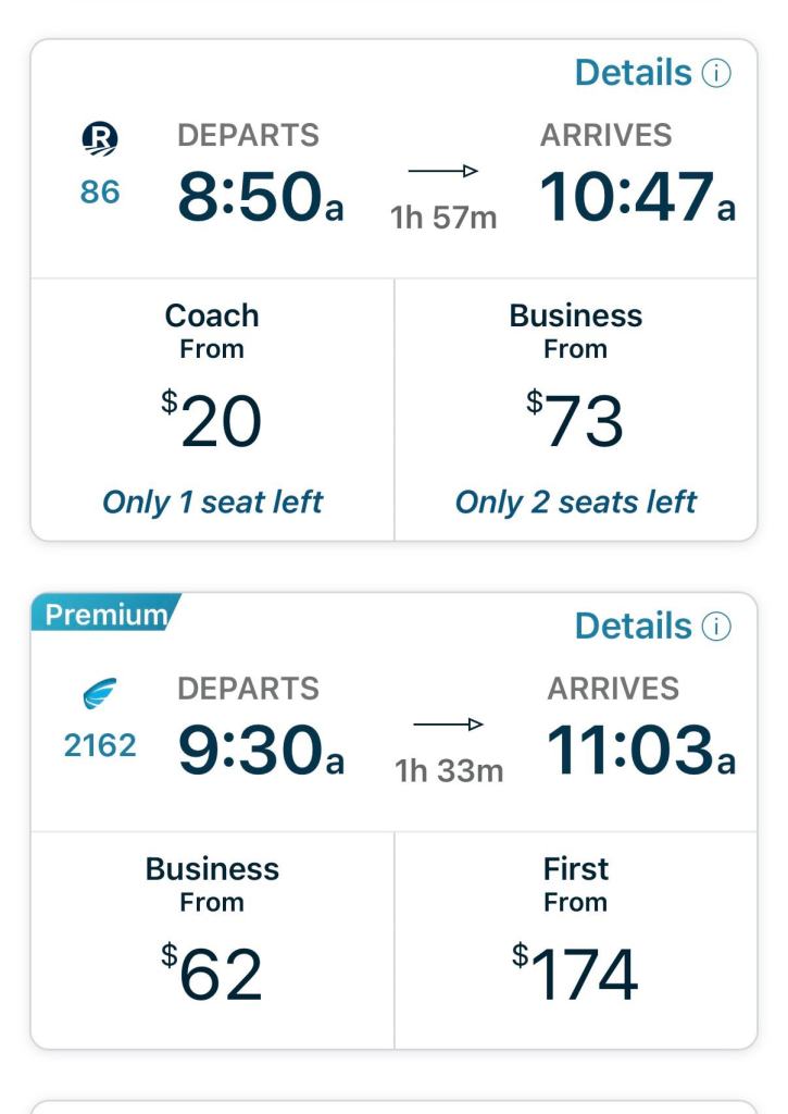 So if you’re just scanning the right column (assuming that’s business), you might completely miss some good Acela options. Acela business is often cheaper than Northeast Regional business, especially off-peak, and it still comes with the coveted assigned seat, which is really the whole reason we book it. So, if you’re planning to ride business class anyway, it’s worth checking both columns every time.