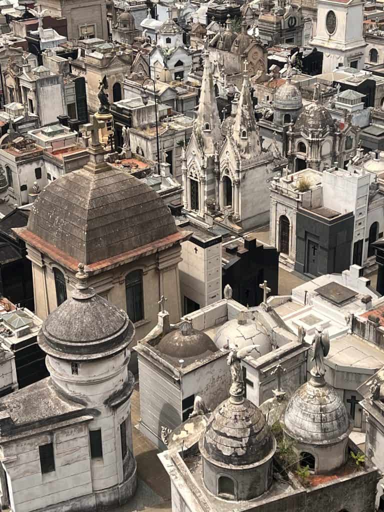 We arrived in Buenos Aires early in the morning and only had one night in this incredible city. There’s so much to explore but we had to narrow it down. Since we love cemeteries, we decided to stay at a lovely hotel that overlooks the Recoleta Cemetery. We splurged ($150) on a comfortable suite at Sileo Hotel, which had a huge balcony with a perfect view of the landmark – that way if we had bad weather or time constraints we’d still be able to see all its beauty.