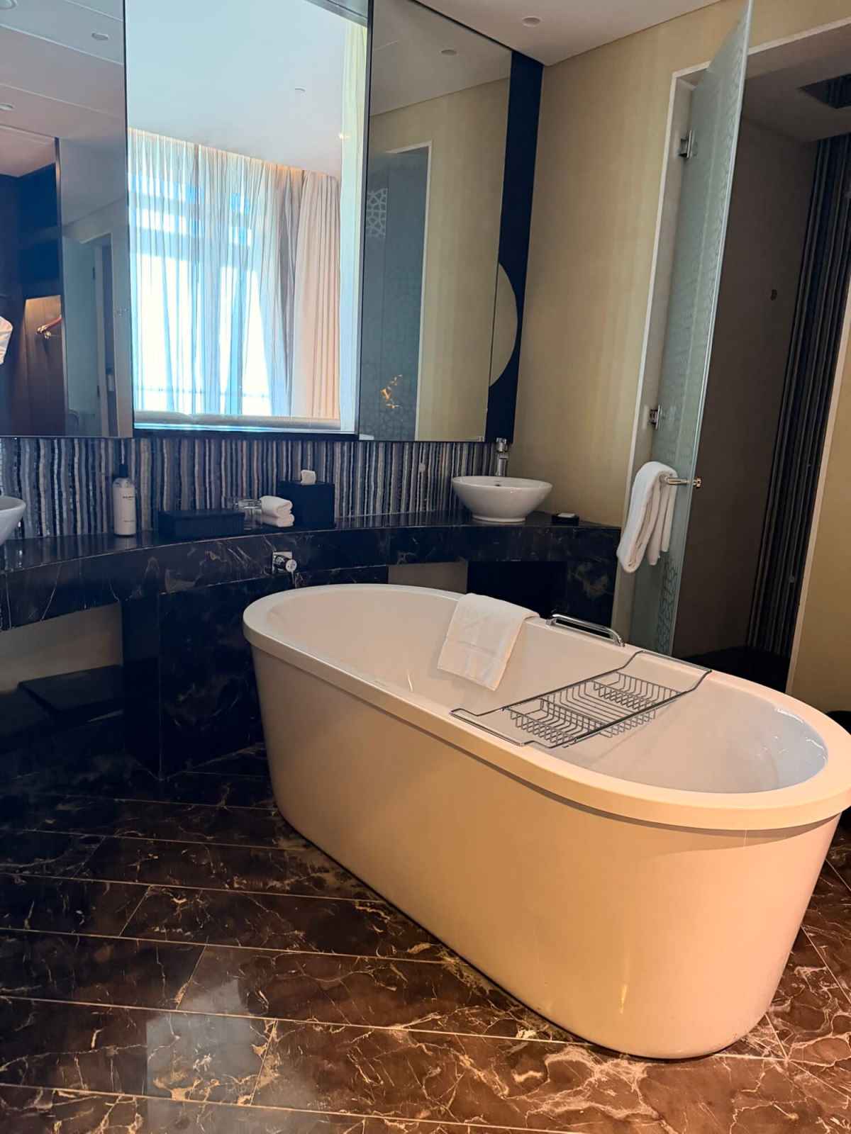 While the staff processed our documents, they provided us with water, hot tea, and even a small sample of perfume. It was a nice touch that added to the high-end feel of the property. We were also eligible for a 2:00 PM late checkout, though we didn’t use it this time as we had an early flight to catch.