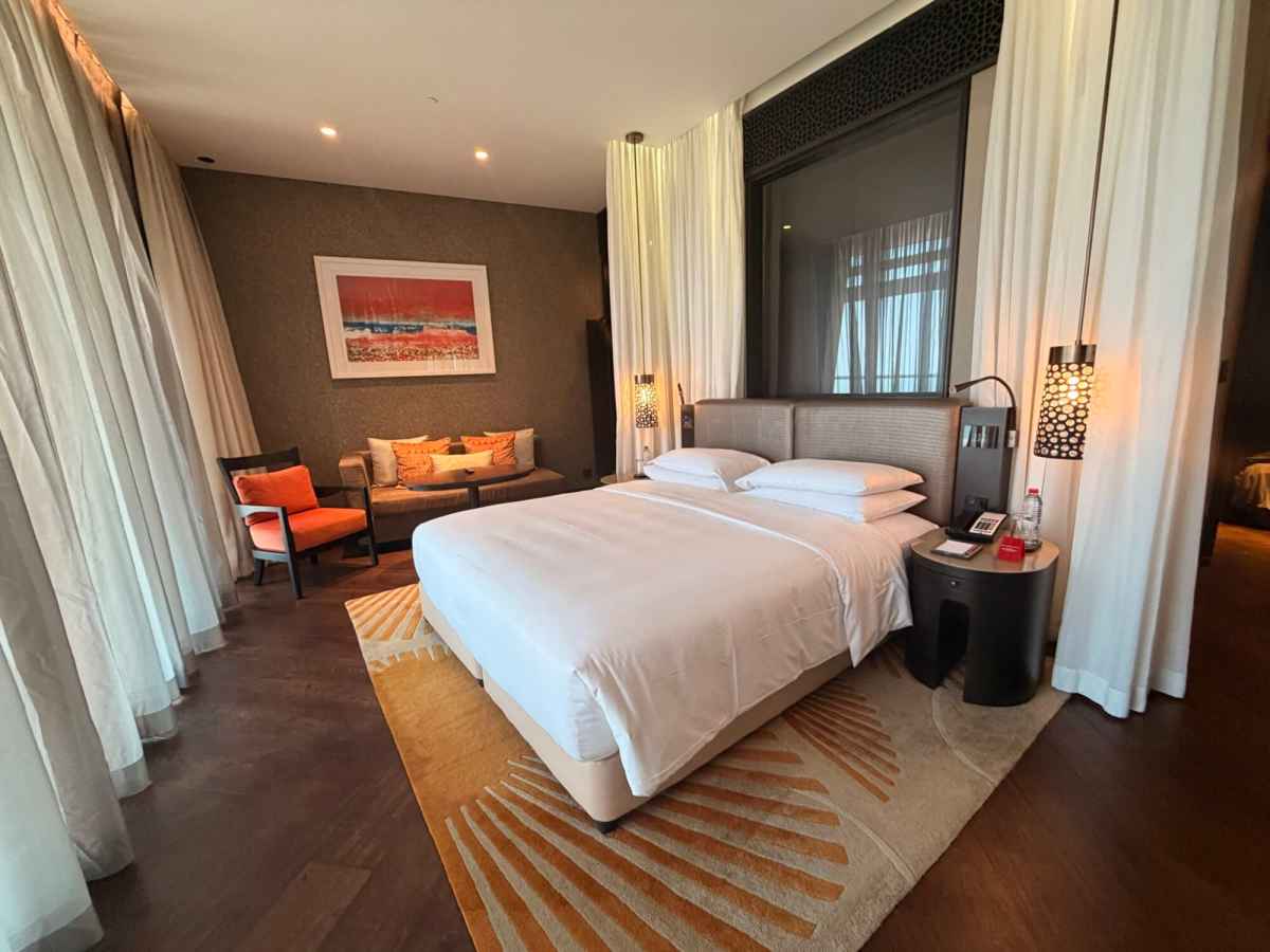 The room design at the Grand Hyatt Abu Dhabi is centered around space and elegance. Our room was a true retreat from the desert heat, featuring a king-size bed positioned between a comfortable sitting area with a couch and a dedicated work desk.