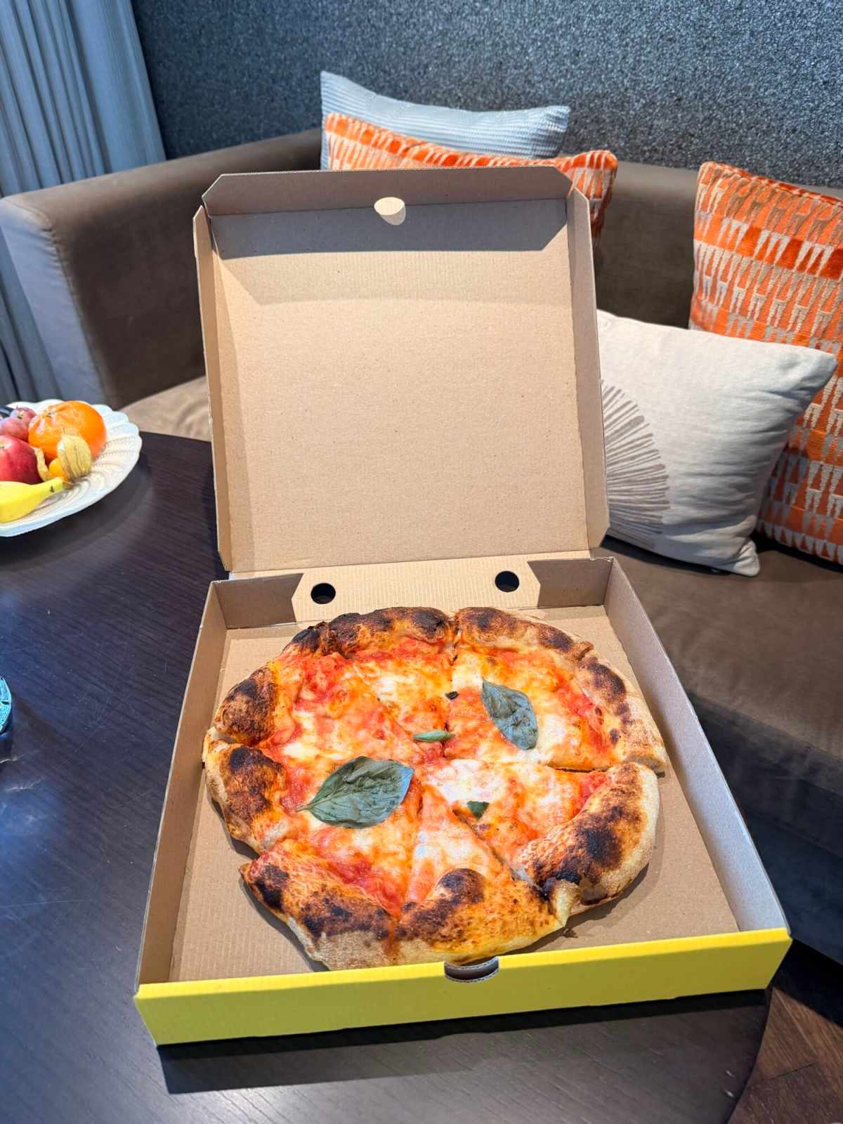 Since our visit was a shorter stay, we decided to skip the formal dining rooms and enjoy the comfort of our room. We ordered a spread of traditional mezze, pizza, and wine through room service.