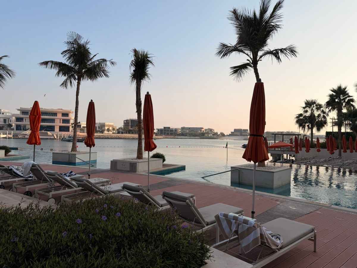 The hotel grounds are expansive, offering plenty of room to wander. The pool area features an infinity edge that looks out toward the Arabian Gulf.