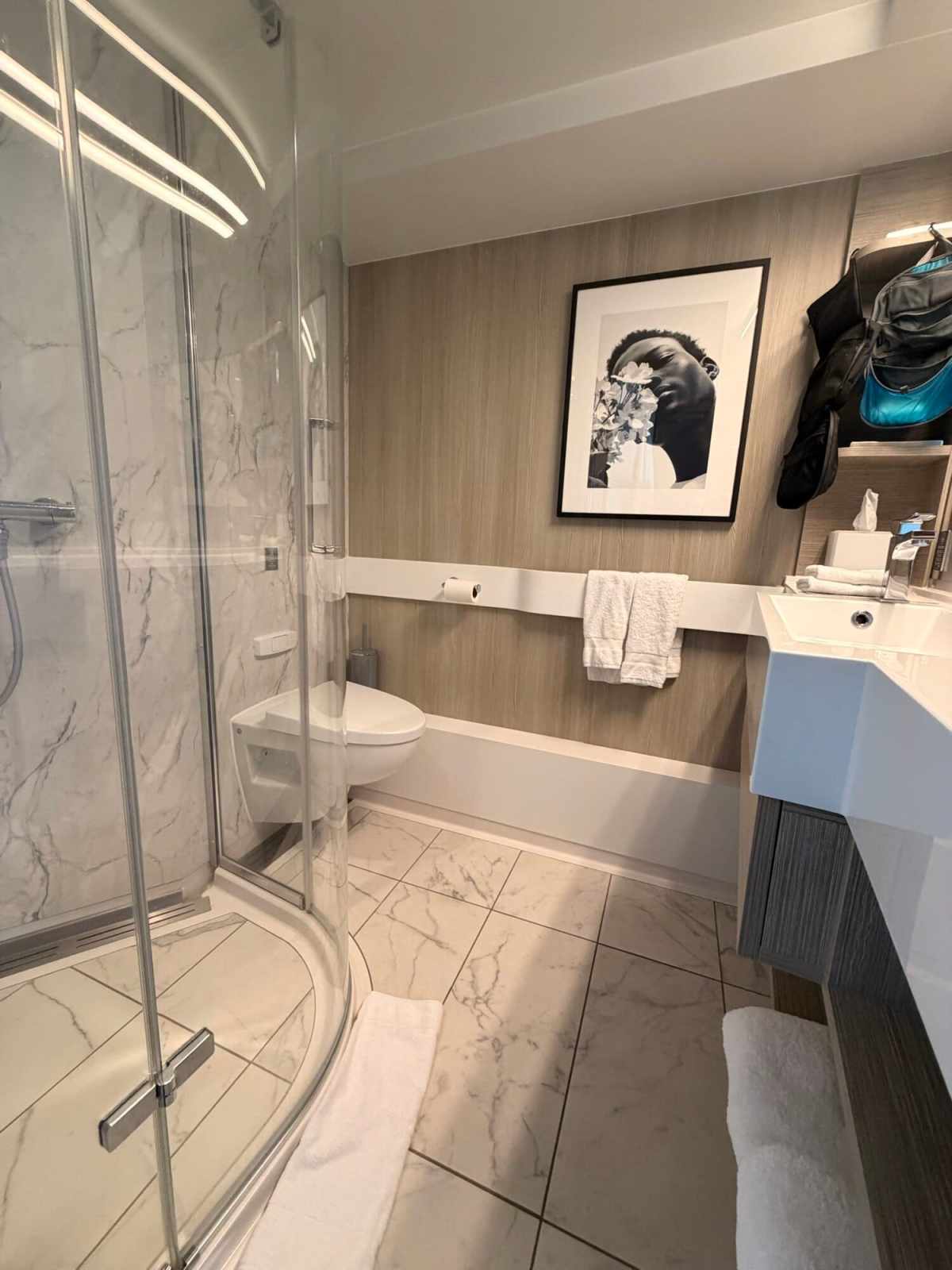 Storage was also good for two. Once unpacked, the room stayed functional and didn’t feel cluttered. That seems to line up with a lot of what other passengers mention too. Reviews frequently call out Edge-class cabins for having smart storage and bathrooms that feel better designed than expected for cruise ship rooms.