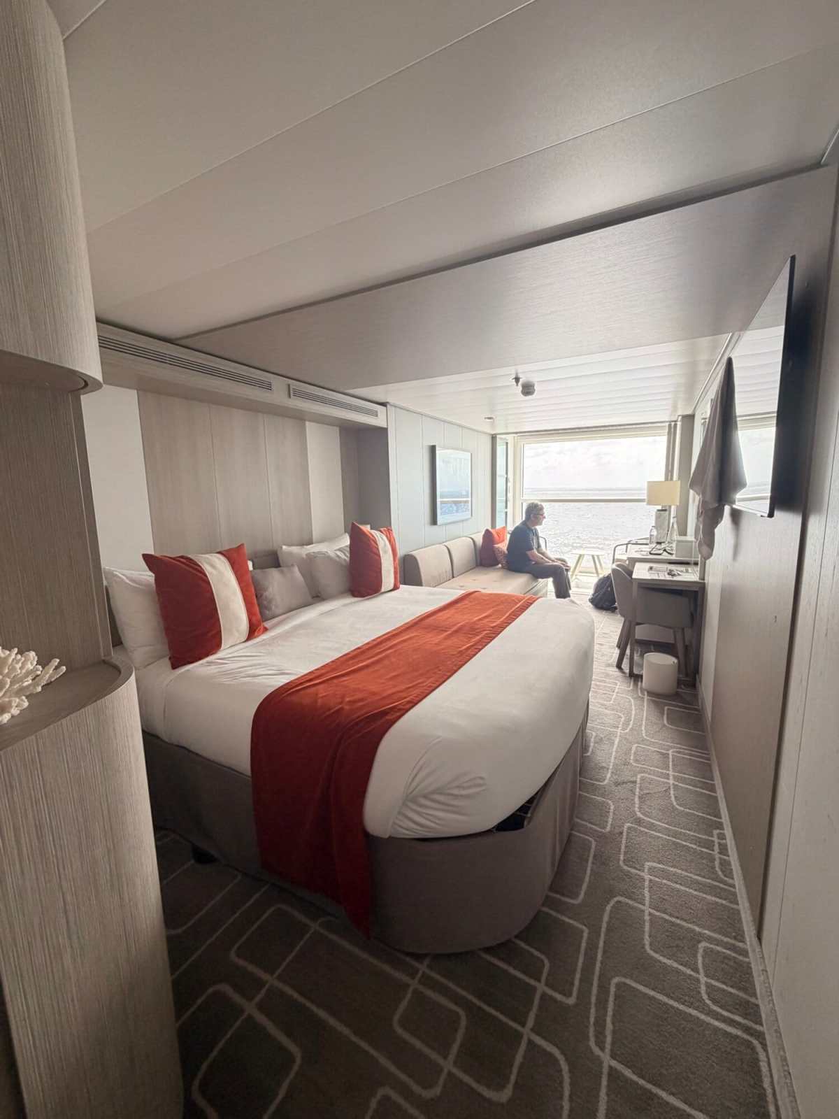 Let’s start with the most debated feature on the ship. The Infinite Veranda is one of the most polarizing parts of the layout. Rather than a traditional, outdoor balcony, the room extends to the veranda indoors and then a large window comes down half-way. Celebrity promotes it as a design that brings the outdoors into the room, and passenger reviews are all over the place, with some people loving the extra interior space and others strongly preferring a traditional balcony. We’re in the first camp. We absolutely loved it.