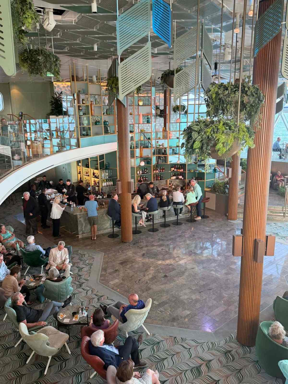 If we had to pick one indoor spot on the ship that best captured the vibe we loved, it would be Eden. This was easily our favorite indoor space. Eden has a garden-like look, but it doesn’t feel kitschy. It has high ceilings, huge windows facing the sea, a classy atmosphere, quirky decor, and some of the best ambiance anywhere on the ship. It felt tucked away and sophisticated.