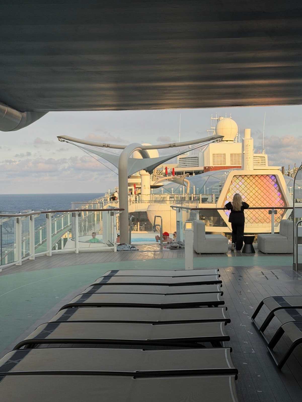 When it was at its highest position, extending out over the side of the ship, it felt surprisingly private. We could sit with a drink, take in the ocean, watch the sunset, or look at the port without feeling crammed into a generic outdoor deck setup. That became a daily ritual for us that was so calming.