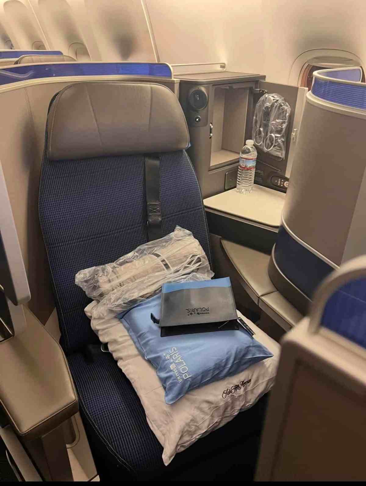 Amenities: We had a nice blanket, pillow, headphones, and amenity kit waiting for us on our seat, which was an added benefit. Impressively, the amenity kits had almost all the same Therabody products as we got in Polaris business class on a separate flight. The case was just different and there were a few less lotions and potions.