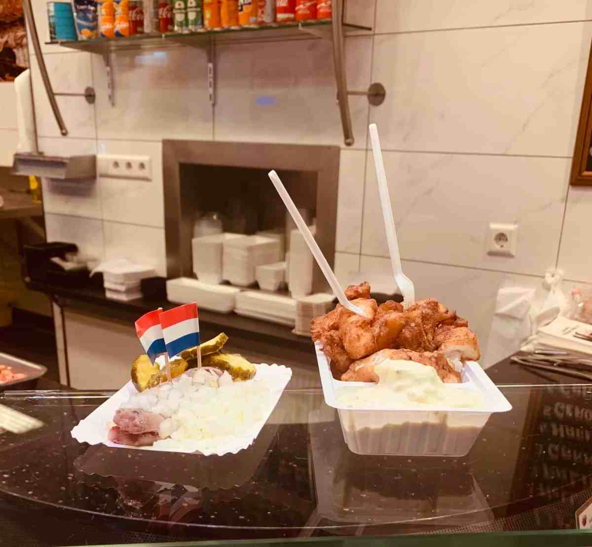 - Haring: raw herring. It’s a Dutch staple and the city’s most divisive food. The traditional way to eat it is to hold it by the tail and lower it into your mouth. We tried it the Amsterdam way, which is served sliced with onions and pickles. We were surprised by how much we enjoyed it.