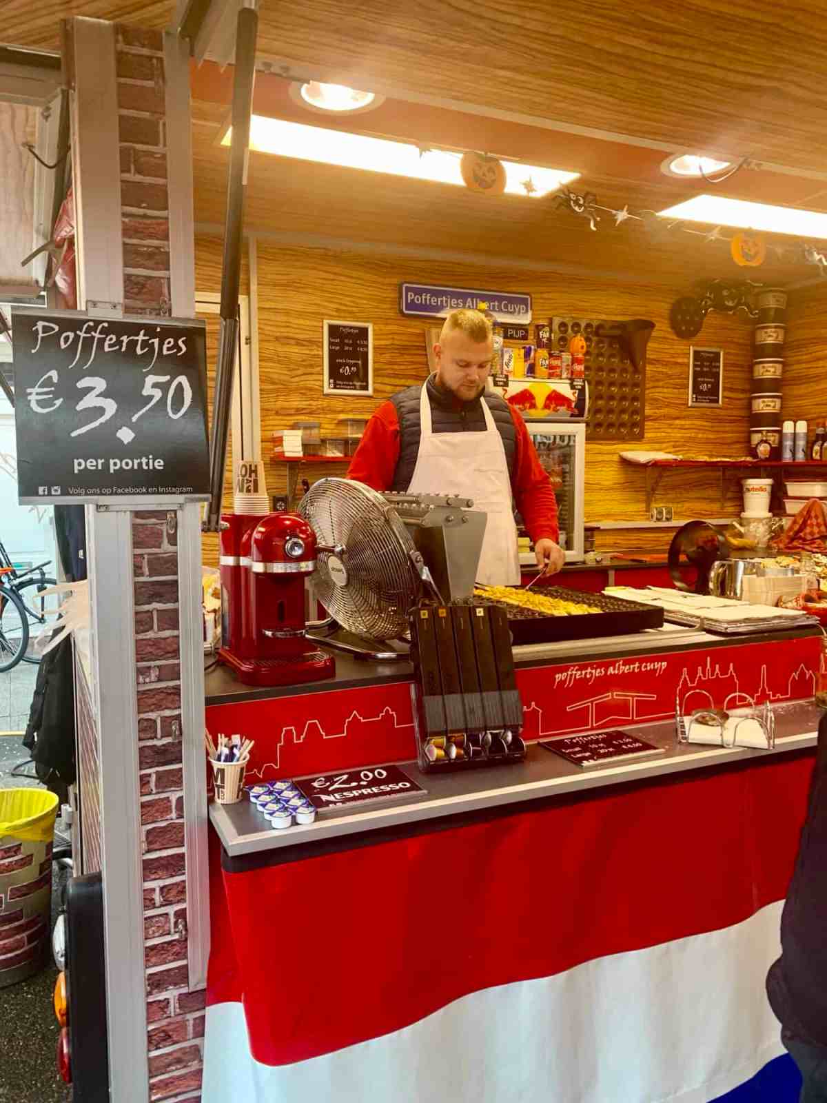 - Stroopwafel: two thin waffle layers with a caramel syrup filling. The ones from Albert Heijn, the Dutch supermarket chain you’ll find at Schiphol and throughout the city, are good. A fresh one from a market stall is even better.